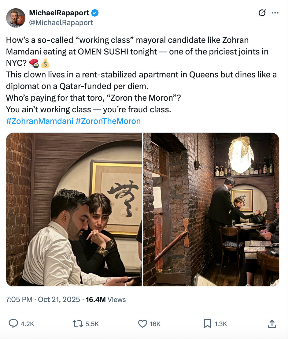 He wrote: “How’s a so-called ‘working class’ mayoral candidate like Zohran Mamdani eating at OMEN SUSHI tonight — one of the priciest joints in NYC? This clown lives in a rent-stabilized apartment in Queens but dines like a diplomat on a Qatar-funded per diem. Who’s paying for that toro, ‘Zoron the Moron’? You ain’t working class — you’re fraud class.”